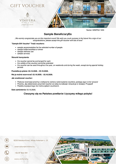 Hodnota poukazu nezahŕňa mestskú daň, ktorú je potrebné uhradiť na mieste. Turistická daň je 740 HUF/osoba/noc.